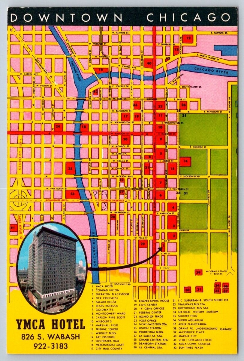 YMCA Hotel Downtown Chicago Illinois Street Map With Points Of Interest Postcard EBay
