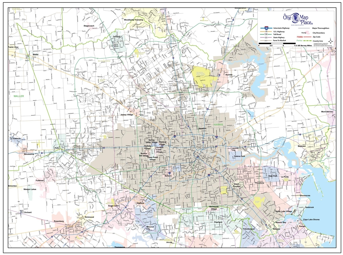 Houston Harris County Major Thoroughfare Wall Map Showing City